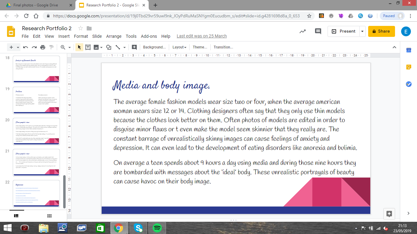 In unit 2 I really enjoyed the whole unit. I especially liked the research part because I found it very interesting finding out facts about mental health and how social media has such an impact on peoples mind set. The photography side was fun and I loved thinking of different ideas to take photos of and I was really pleased with how my photos turned out. A weakness would be I didn’t have enough photos so there wasn’t a variety and I think that lowered my mark.