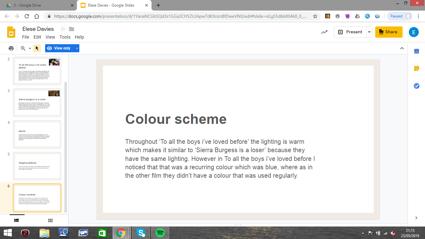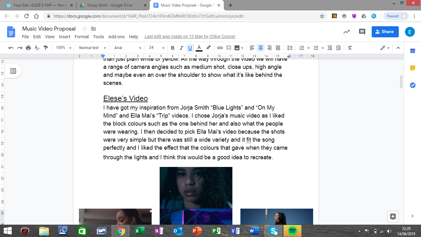 I enjoyed filming the music piece and playing around with the lights to see how we wanted it to look like on the camera. I thoroughly enjoyed working with Kelsey and I think that she performed really well. It took a while to find how we wanted it to look but once we sorted it, it looked really good on the camera. I also enjoyed the research part of the production because I found it really fun to pull apart already made music videos and analyse them.