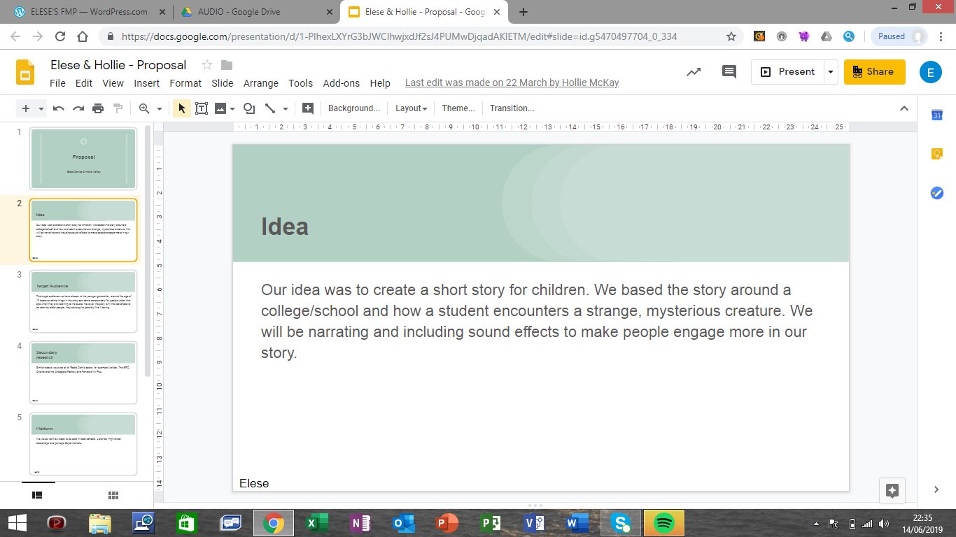 I thought it was really good to listen to, the sound effects were really good and linked really well with the story-line. One improvement would be to make sure all of the sound effects fade in and out throughout the story so then it will run smoothly.